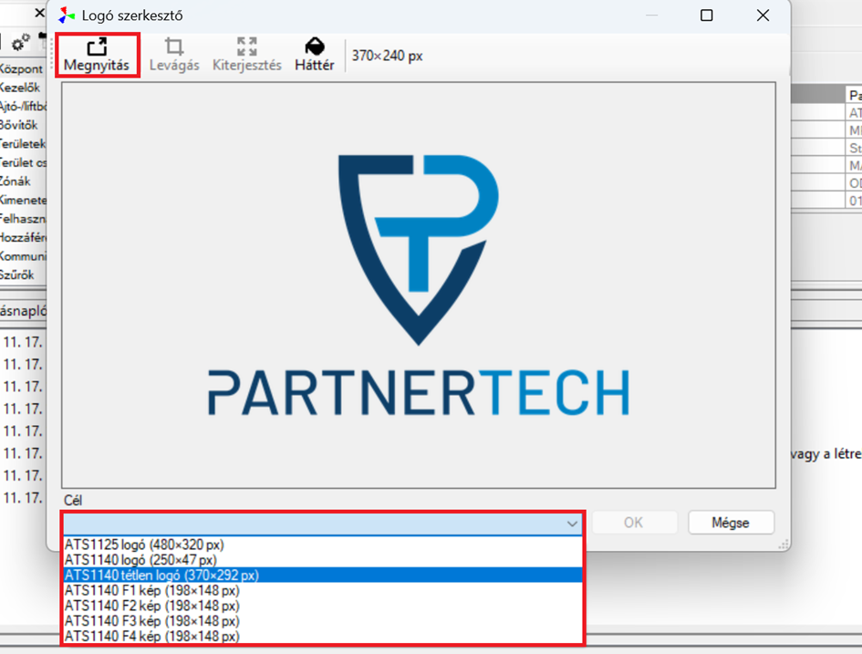 A szoftverben a Logó módosítása menüpontot kell megnyitni. Itt a Megnyitás gombra kattintva tudunk egy képet választani, amit logóként (vagy funkciógomb képként) szeretnénk használni.