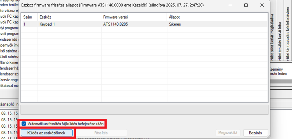 Ha a kép beállítását elvégeztük és a frissítés végbement, menjünk a Vezérlés menüpontba, ahol Műveletek à Eszköz firmware frissítés állapot à Küldés az eszközöknek (Automatikus frissítés fájlküldés befejezése után legyen bepipálva) opciót végezzük el. Ez eltarthat néhány percig. Minden feltölteni kívánt képnél külön, egyesével szükséges ezt elvégezni. Tehát, ha szeretnénk beállítani például egy logót és egy tétlen logót, akkor először az egyiknél fel kell tölteni a képet, majd a Vezérlés menüpontban szükséges lépéseket elvégezni, és aztán ugyanezeket megtenni a másik esetében is.